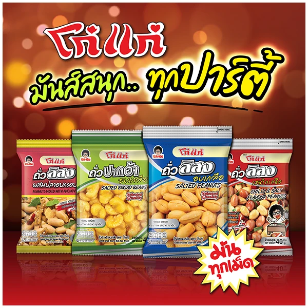 โก๋แก่เป็นแบรนด์ถั่วลิสงอบกรอบและขนมขบเคี้ยวที่ได้รับความนิยมในประเทศไทยมาอย่างยาวนาน มีผลิตภัณฑ์หลากหลายรสชาติและรูปแบบให้เลือกสรร ดังนี้