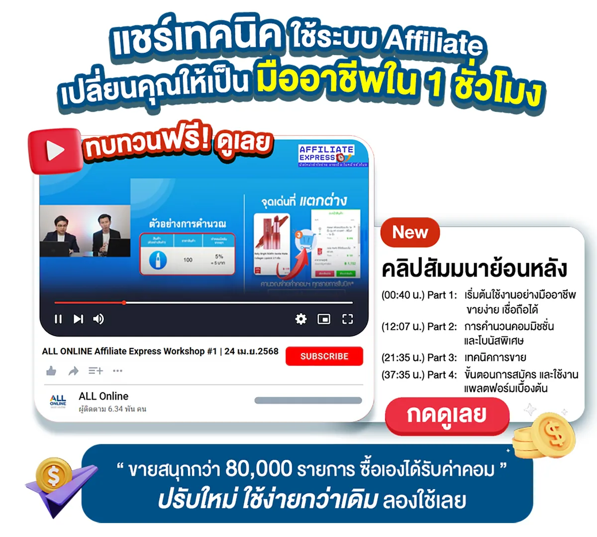 A: ทางระบบจะนับยอดขายทุกรายการสินค้าที่ลูกค้ากดผ่านลิงก์ หรือ QR ของ Affiliator (หากตะกร้าเดิมของลูกค้ามีรายการสินค้าอื่นที่รอชำระเงินอยู่ เมื่อชำระเงินสำเร็จ จะนับเป็นยอดขายเช่นกัน)