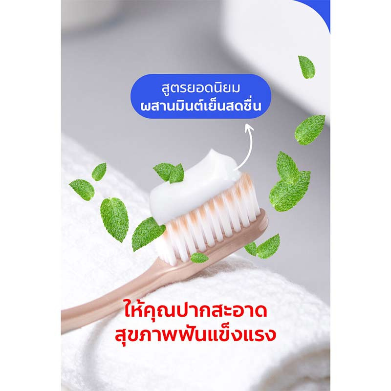 - คอลเกตรสยอดนิยม มีส่วนผสมของลิควิดแคลเซี่ยมและฟลูออไรด์ช่วยให้ฟันแข็งแรงป้องกันฟันผุ และรสมินท์ทำให้ลมหายใจหอมสดชื่น