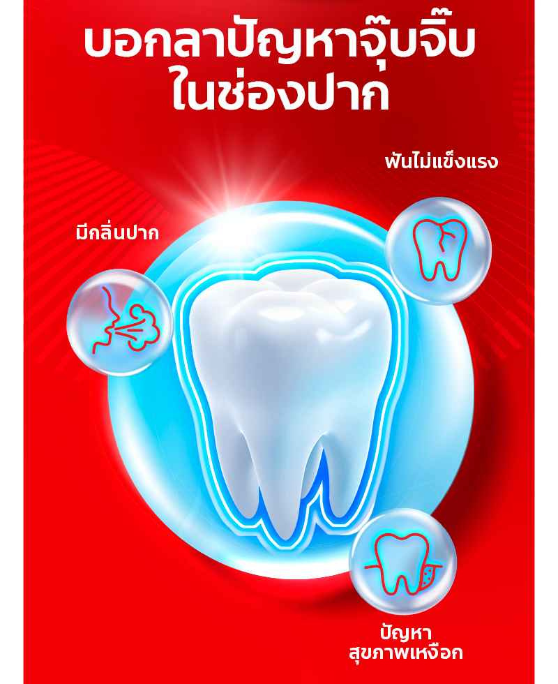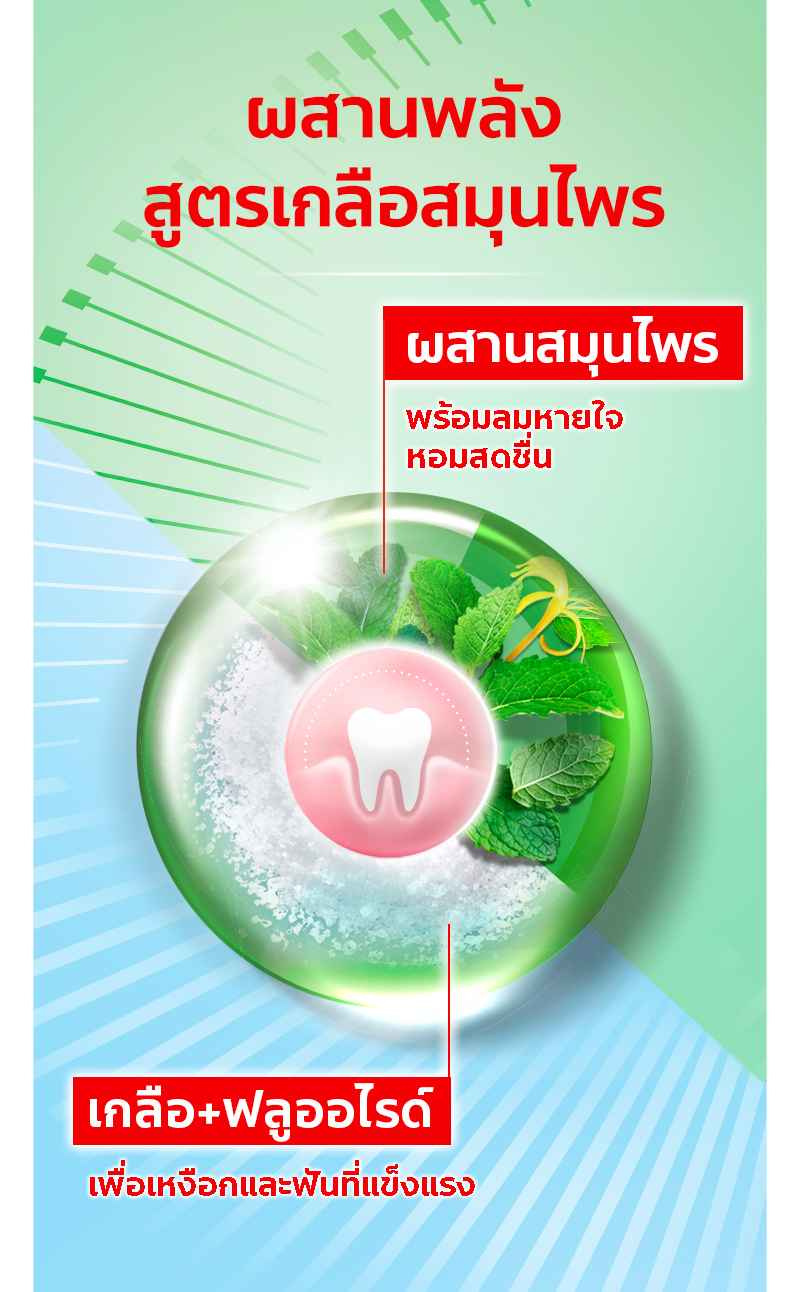 - มีเกลือ สมุนไพรผสานเข้ากับแคลเซียมและฟลูออไรด์ เพื่อการปกป้องอย่างครบสูตร