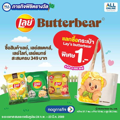 ซื้อสินค้าเลย์ สะสมครบ 349.- ขึ้นไป แลกรับ คูปองแลกซื้อกระเป๋า Lay's Butterbear พิเศษ 1.-
