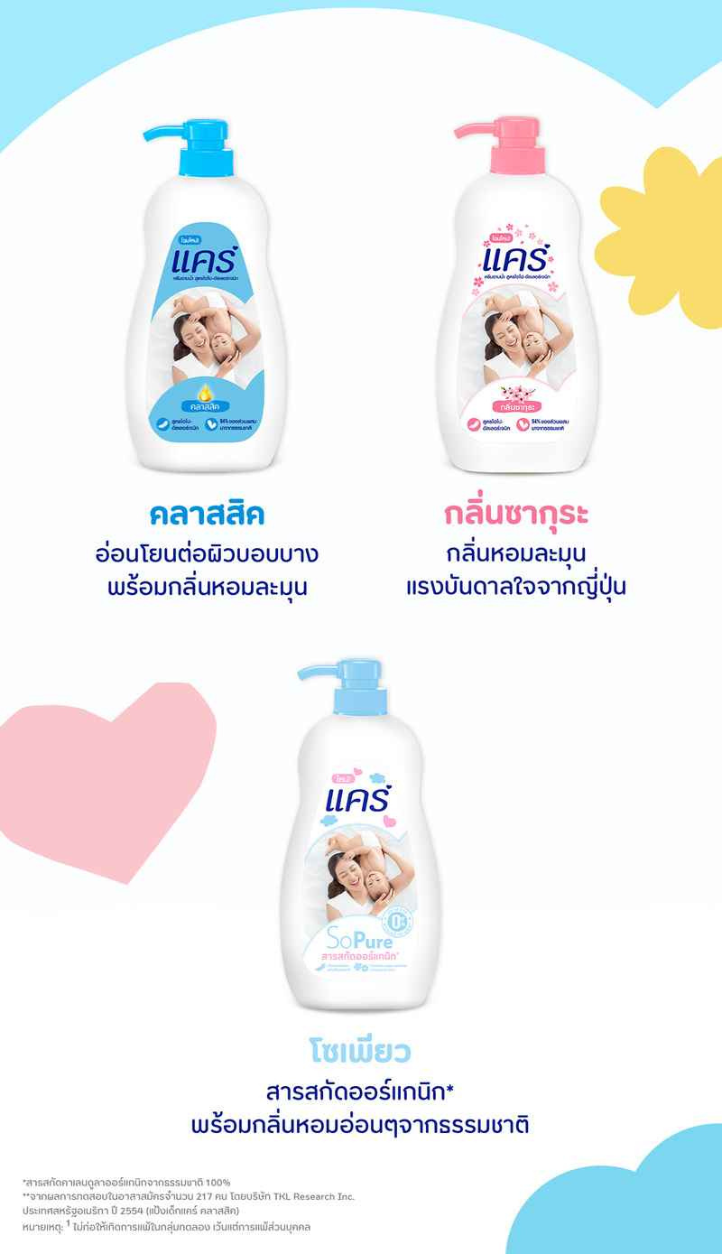 ครีมอาบน้ำแคร์ กลิ่นซากุระ มอบกลิ่นหอมละมุน แรงบันดาลใจจากญี่ปุ่น ส่วนผสมมาจากธรรมชาติ 94% ช่วยทำความสะอาดผิวลูกน้อยอย่างอ่อนโยน แคร์ครีมอาบน้ำกลิ่นซากุระ ผ่านการทดสอบไฮโป-อัลเลอร์เจนิกและทางการแพทย์ผิวหนังสหรัฐอเมริกา แล้วว่าเป็นสูตรที่อ่อนโยนไม่ก่อให้เกิดการระคายเคืองหรือการแพ้ ปลอดภัยต่อผิวบอบบางเสมือนผิวลูกน้อย ปราศจากพาราเบน ซิลิโคน สีสังเคราะห์ และส่วนผสมของสบู่ที่มีความเป็นด่าง ให้ผิวลูกน้อยหอมละมุนยาวนาน แบบที่คุณไม่เคยสัมผัสมาก่อนจากแคร์