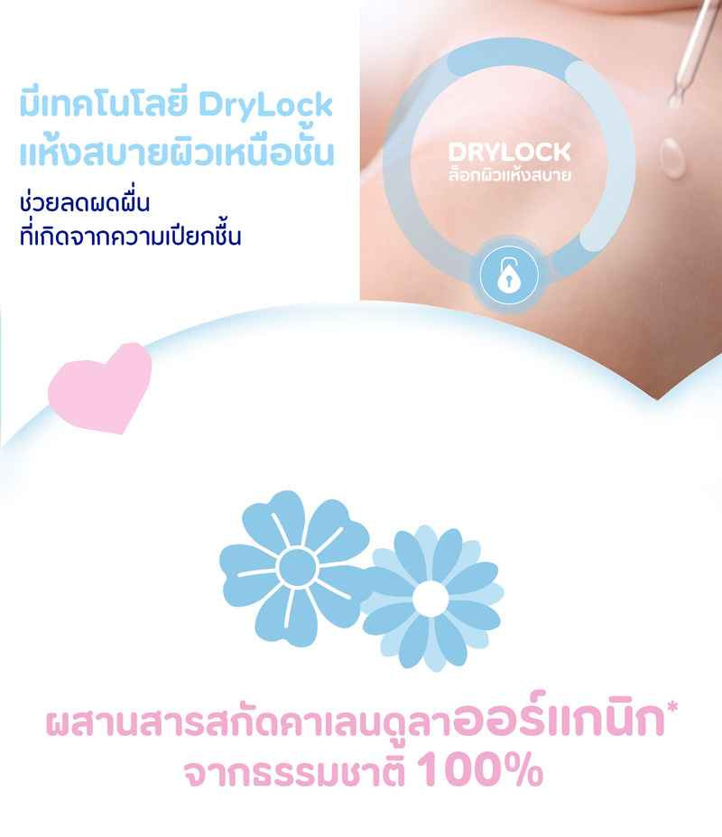 ผสานสารสกัดออร์แกนิก มาพร้อมเทคโนโลยี DryLock แห้งสบายผิวอย่างเหนือชั้น ช่วยปลอบประโลมผิว ช่วยลดผดผื่นที่เกิดจากความเปียกชื้น พร้อมมอบกลิ่นหอมอ่อนๆจากธรรมชาติ