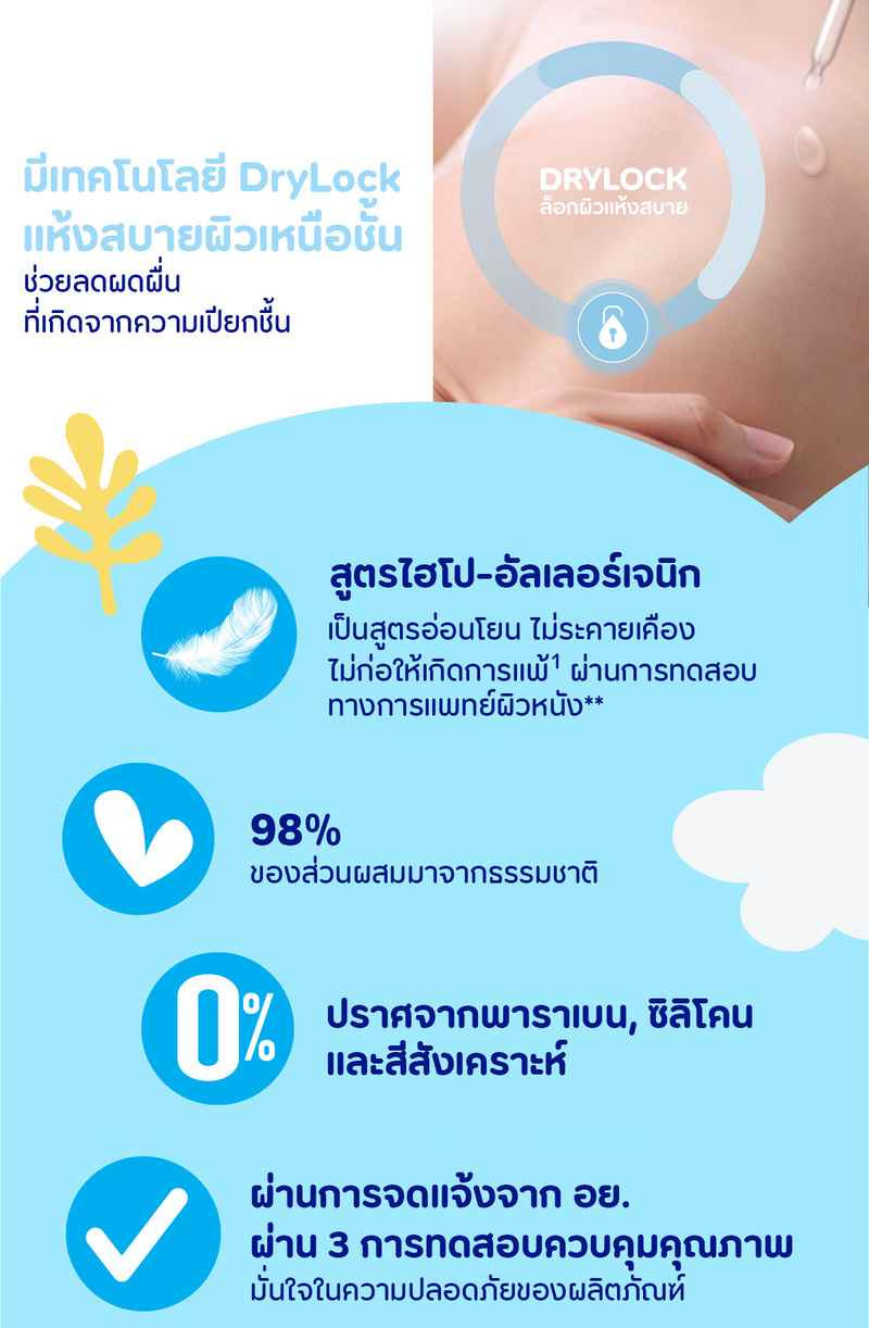 - สกัดธรรมชาติจากขมิ้น มีคุณสมบัติช่วยลดผดผื่นจากความเปียกชื้น