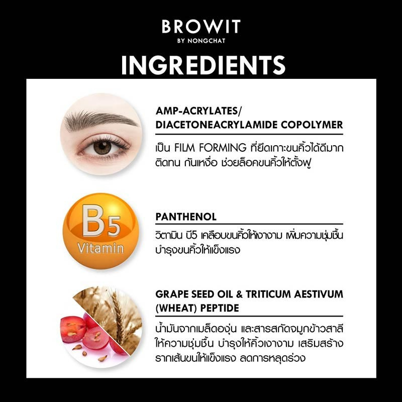 - (diamond)ผสานการบำรุงด้วยน้ำมันจากเมล็ดองุ่น, สารสกัดจากจมูกข้าวสาลี และวิตามิน บี5 ช่วยให้ขนคิ้วหนา เงางาม