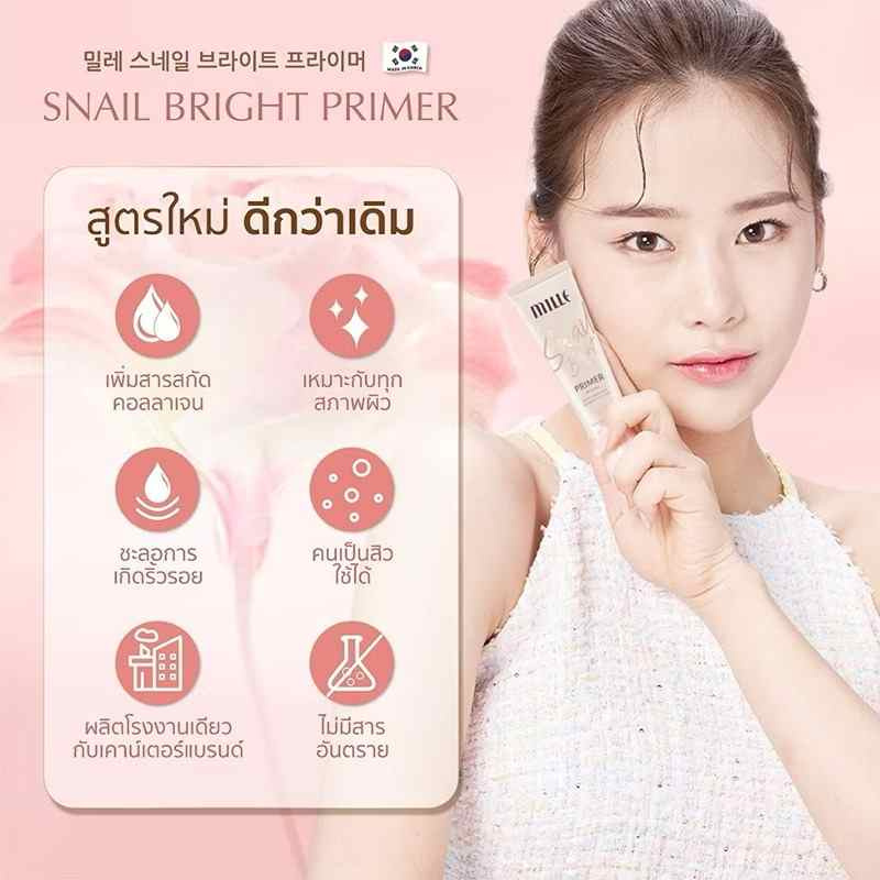 MILLE ไพรเมอร์ Snail Bright Primer เป็นไพรเมอร์เนื้อบางเบา เหมาะกับทุกสภาพผิว ช่วยเบลอรูขุมขน ให้ผิวเรียบเนียน เบลอรูขุมขนได้ดี พร้อมปรับสีผิวให้กระจ่างใสขึ้น 1 ระดับ ควบคุมความมันระหว่างวันยาวนาน มีส่วนผสมของกันแดด SPF15 PA+ และสารสกัดจากเมือกหอยทากเพิ่มความยืดหยุ่นกระชับให้แก่ผิว มอบความชุ่มชื้นให้ผิวหน้าสวยผ่องดูสุขภาพดีตลอดเวลา ไม่หมองคล้ำระหว่างวัน MILLE ไพรเมอร์ Snail Bright Primer มีเนื้อสัมผัสที่บางเบา เกลี่ยง่าย ซึมซาบเร็ว ไม่เหนียวเหนอะหนะ ทาแล้วรู้สึกผิวชุ่มชื้น
