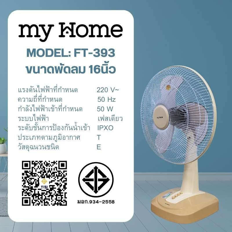 My Home พัดลมตั้งโต๊ะ 16 นิ้ว รุ่น FT-393 ดีไซน์เรียบง่าย ใช้งานสะดวก ให้ลมเย็นสบายทั่วถึง