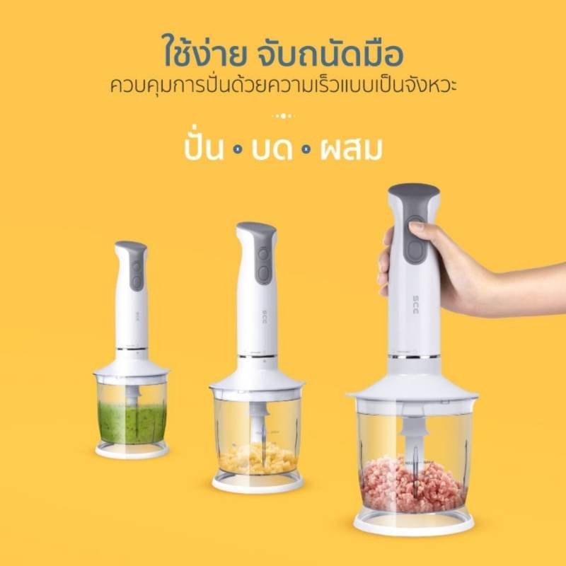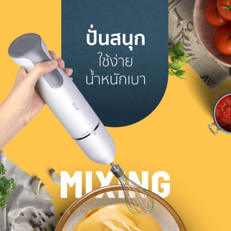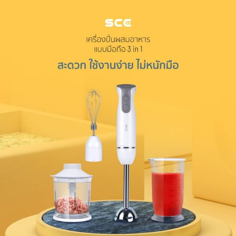 SCE Plus เครื่องปั่นผสมอาหารมือถือ 3 in 1 ใช้สำหรับปั่นหรือบดส่วนผสมต่าง ๆ ให้เข้ากัน ดีไซน์สวยงามทันสมัย ใช้งานง่ายจับถนัดมือ น้ำหนักเบาและเสียงเงียบ ควบคุมการปั่นด้วยความเร็วแบบเป็นจังหวะ สามารถปรับความแรงได้ถึง 2 ระดับ สะดวกในการใช้งานกับวัตถุดิบประเภทต่างๆ