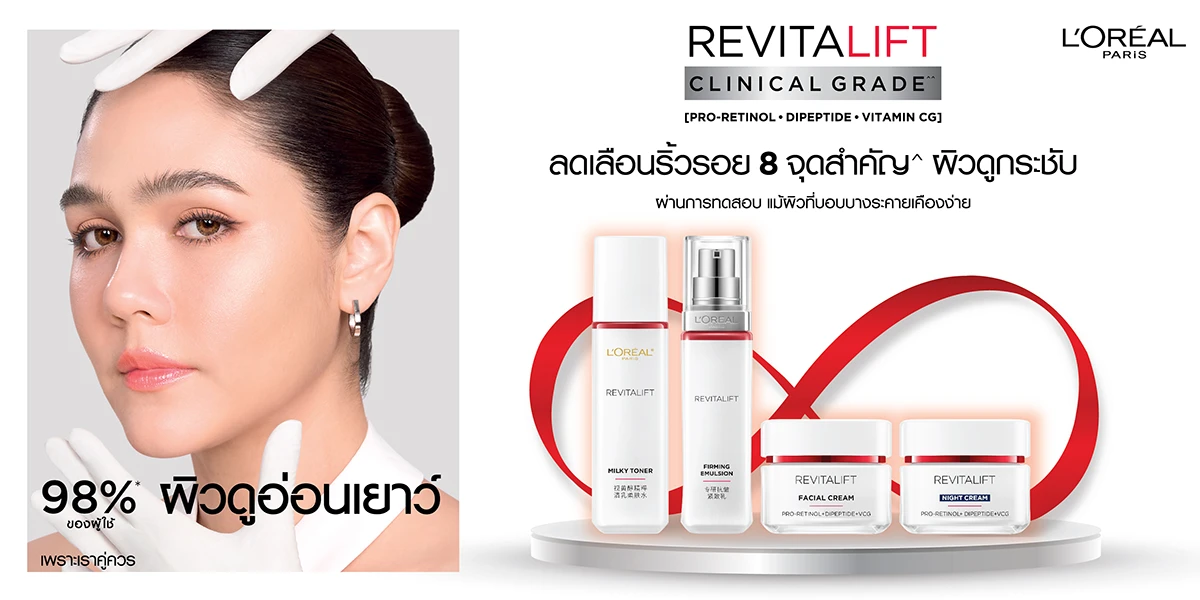 L'Oréal Revitalift ผลิตภัณฑ์บำรุงผิวหน้าเพื่อลดเลือนริ้วรอยและเพิ่มความกระชับให้กับผิวด้วยเทคโนโลยี Pro-Xylane ที่ช่วยกระตุ้นการสร้างคอลลาเจนในผิว ช่วยให้ผิวดูอ่อนเยาว์และเปล่งปลั่ง สัมผัสผิวที่เรียบเนียน อิ่มน้ำ